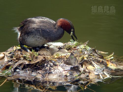 【カイツブリ目カイツブリ科】 二日前のことだが小雨にけぶる溜池を訪ねた。 カイツブリは相も変わらず不出来な浮巣に固執。 連日観察している方によれば前日段階で2個あったはずだという卵が1個しか見あたらない。 二日もたてば赤味を帯びるはずの卵が純…