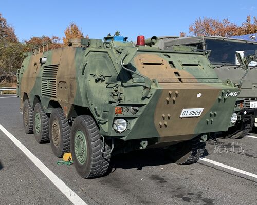 NBC偵察車(コマツ) 所用で出かけた仙台からの帰り道、常磐道の中郷SA(上)で遭遇した陸上自衛隊の車両。一見すると4軸8輪の装輪装甲車のようでもあるけれど、それにしては車幅がタイトだったり車高が高かったり違和感アリアリ。ひょっとしたら記憶の隅に…