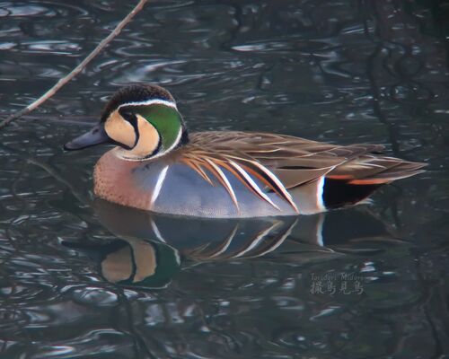 トモエガモ(巴鴨) この冬の日本列島はトモエガモの当たり年だったようだ。島根の宍道湖では58,000羽、千葉の印旛沼にいたっては66,000羽の飛来が確認されたとか。そんな中で近所の雨水調整池でも数十羽のオシドリに紛れて雌雄2羽づつ4羽のトモエガモが越冬…