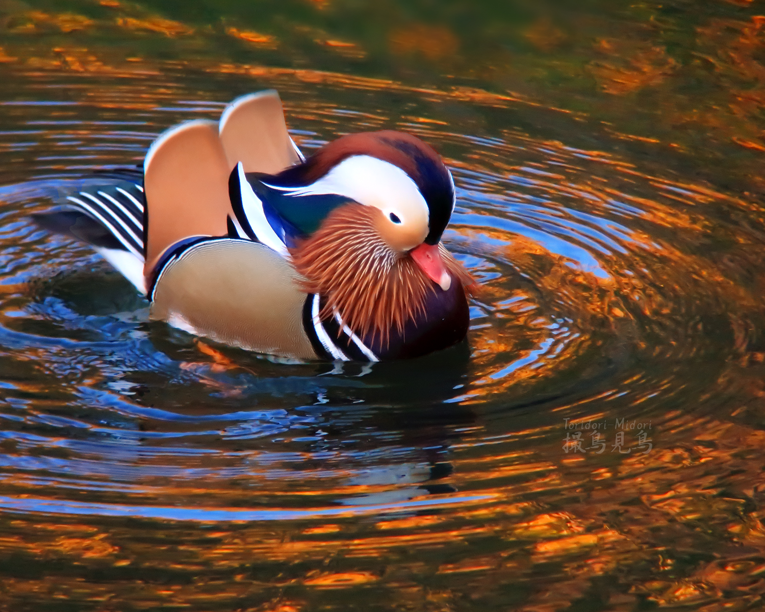 いつもの地元雨水調整池だが、生い茂る草木に視界を阻まれて撮影アングルが限られてしまう。僅かな水面域に背後の赤黄に萌える小山が映り込んでいたので、オシドリがフレームに収まるタイミングをひたすら待って撮影してみた。